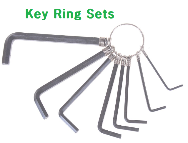 스프링 고정 클립이 있는 키 링에 장착된 기본 L자형 육각 또는 토크 키입니다. 이 키 세트는 매우 저렴하며 편의를 위해 집이나 차에 보관할 수 있습니다. 긴 암을 사용하려면 고정 클립에서 키를 비틀고 당겨야 합니다. 교체하려면 키를 누르고 비틀어야 합니다.